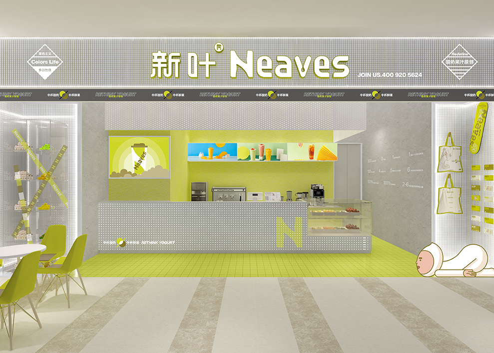 新叶标准小店,应该品牌方的需求,以主视觉「新叶绿」为视觉冲击;整体呈灰调,门头及二侧铝格栅配以透明树脂板,四周灯带;吧台冲孔板发点状微光;墙面配以水泥墙,整个水吧从操作台「新叶绿」一直延伸至地面,与不锈钢的品牌IP相呼应。