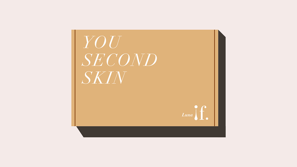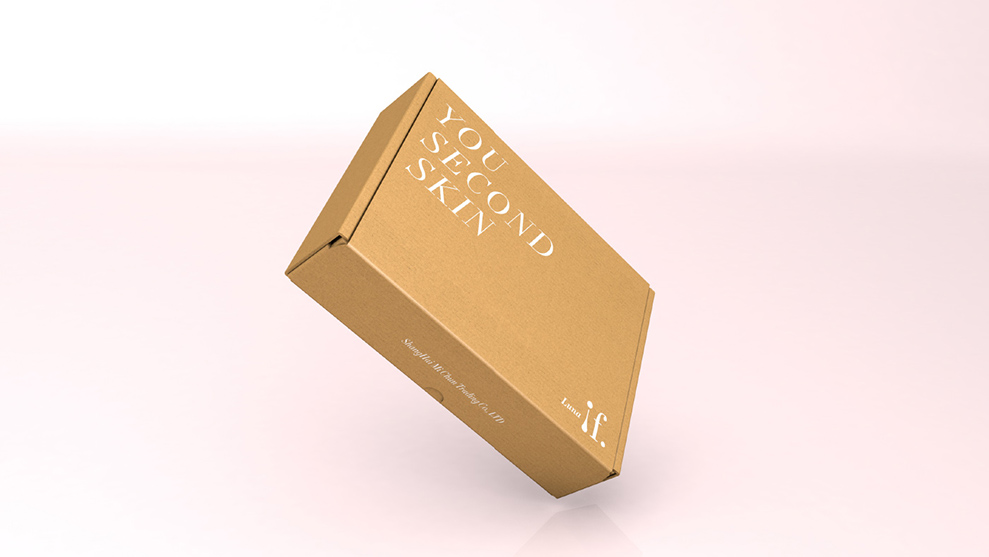 瓦楞纸运输盒,正面广告语(you second skin-你的第二肌肤)及标志,开启处为公司产品名称。