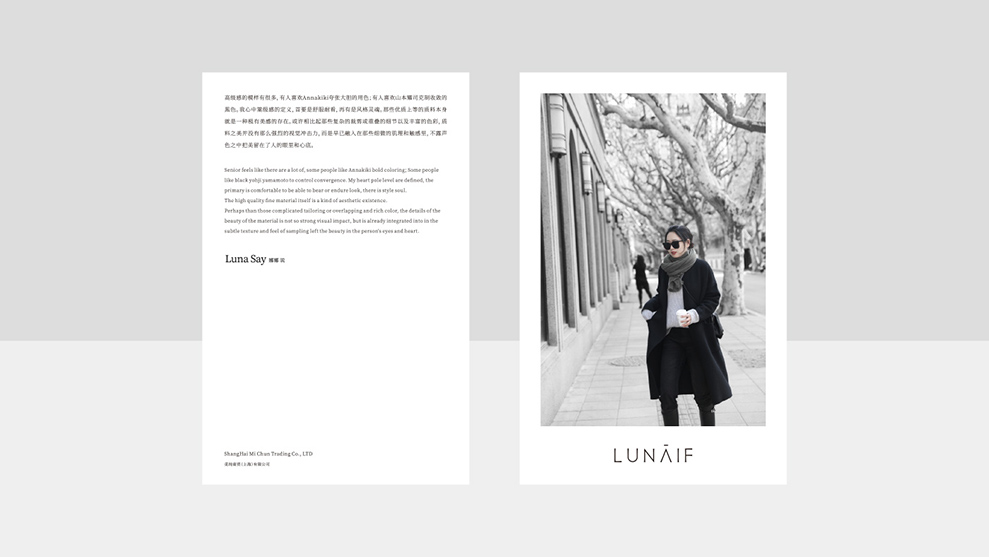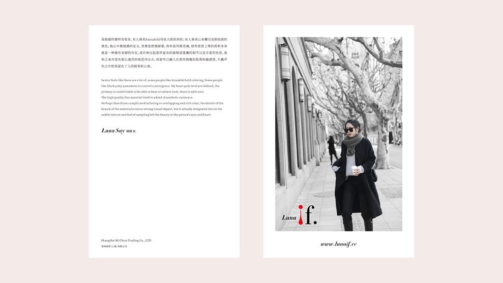 LUNA IF 是我们服务过的服饰品牌<开希米娜>转介绍的客户,通过2019年服务<开希米娜>,2021年服务<恒莱服饰>后,又一服饰品牌,客户来自于上海,其品牌创始人LUNA.劳拉是一位时尚博主,从兼职到全职,做时间的朋友,其经营的淘宝店铺做到:极简休闲女装店铺榜-TOP 9。