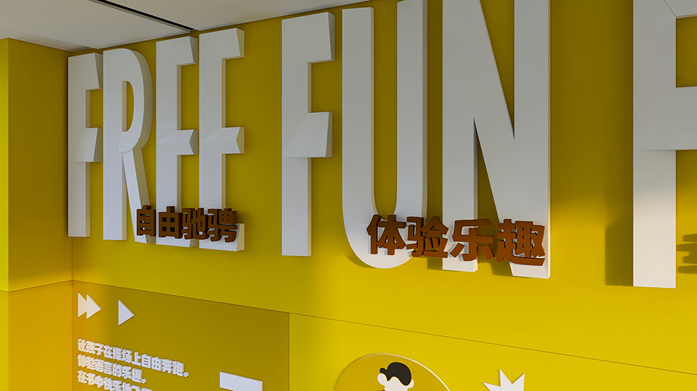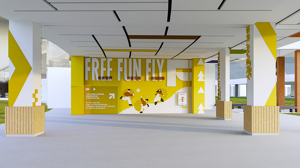 校训主题墙:以学校校训“FREE-自由驰骋,FUN-体验乐趣,FLY-幸福翱翔”为主题,运用暖黄、白色及棕色,营造轻松、欢快、温馨的氛围场景