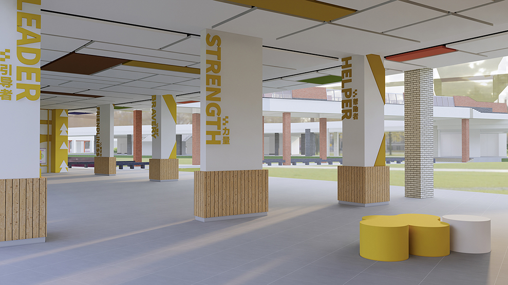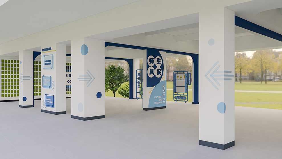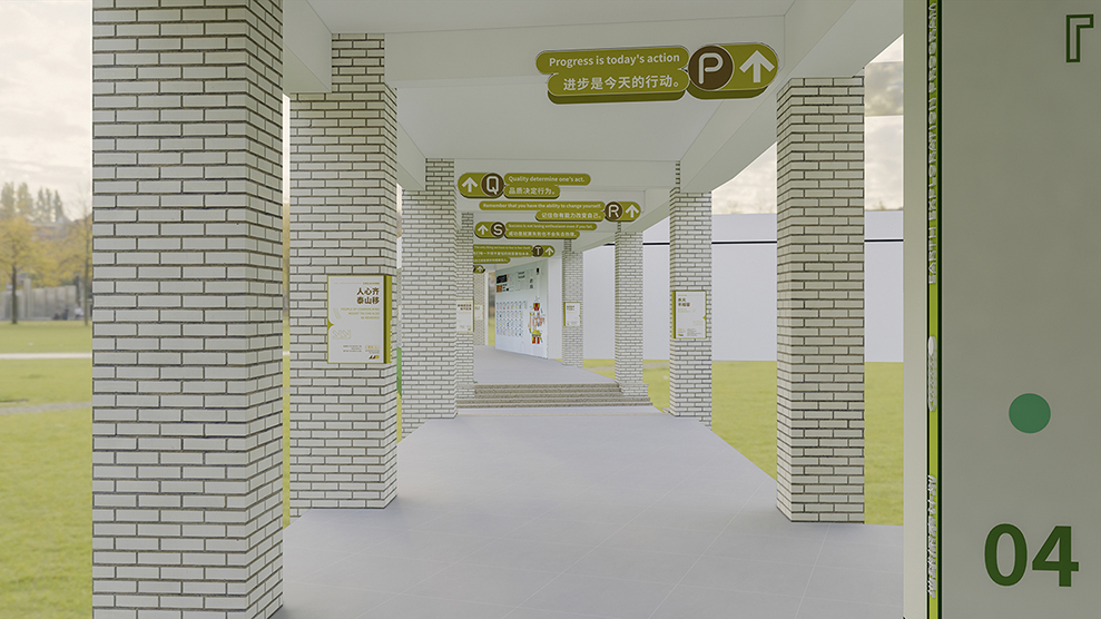 该空间以教学楼 (一、二、三) 至实验楼,整个长廊为主,进行定位定点设计,从a到z英文励志短语为主题,隔一个梁位分别进行挂牌设计,如: