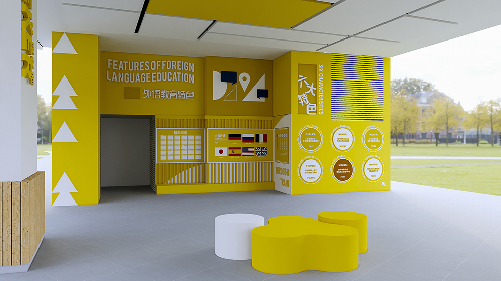 外语教育特色墙:以车站站台为原型,介绍了学校六大外语(德语+俄语+法语+日语+西班牙语+英语)的特色,配以学生们丰富多彩的语言场景照片,突显教学学校特色,同时提升整个空间趣味性。