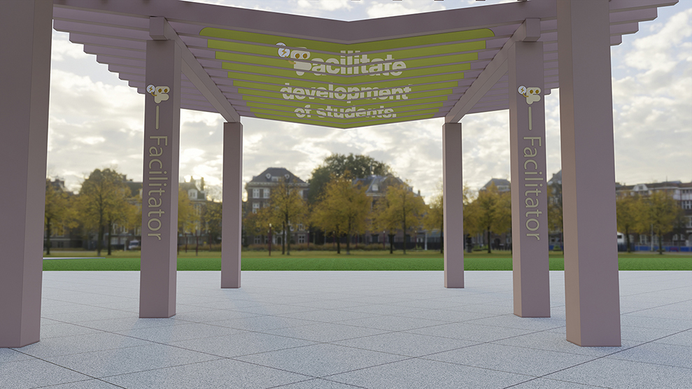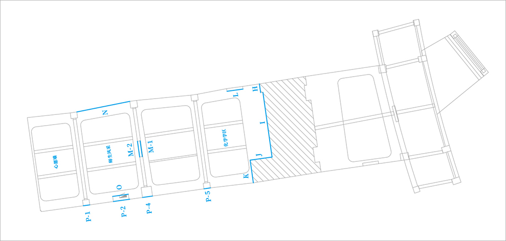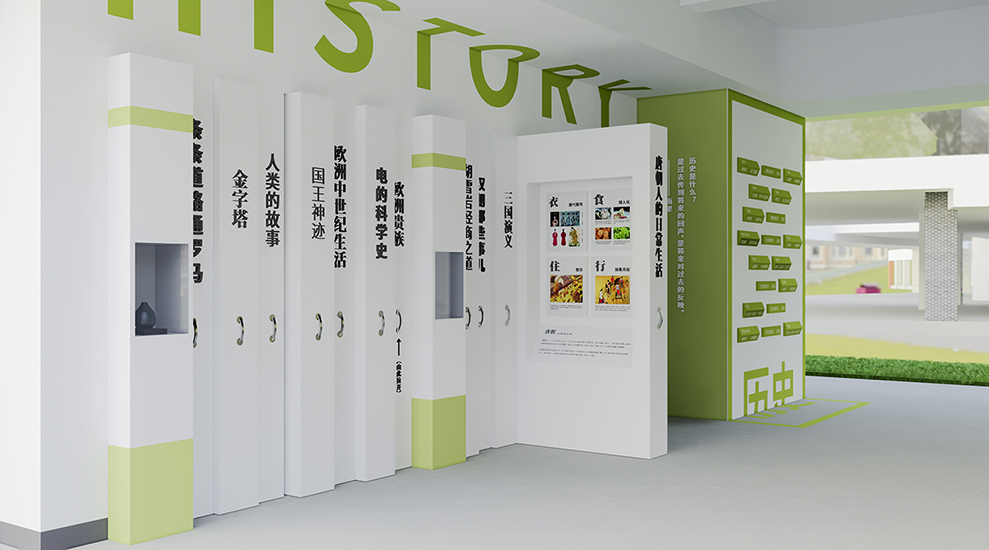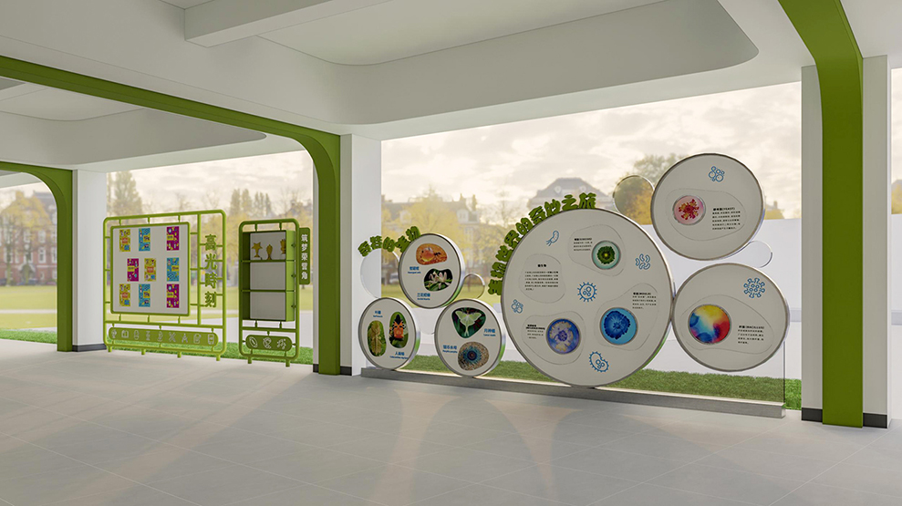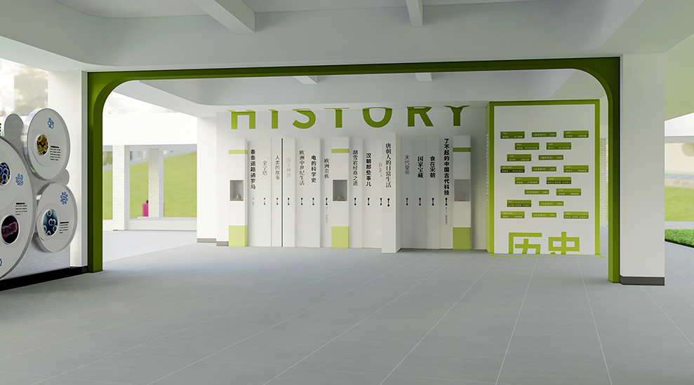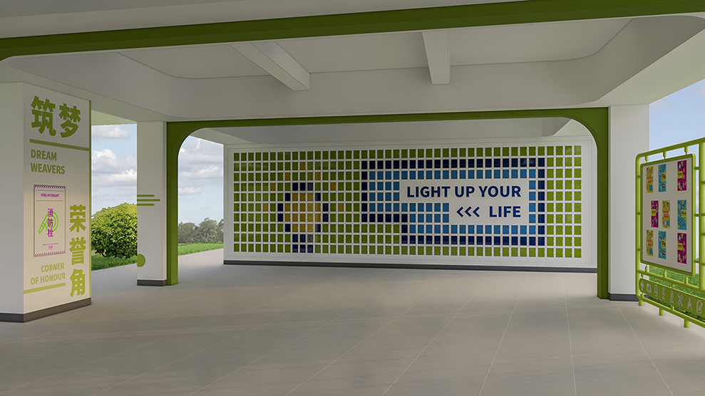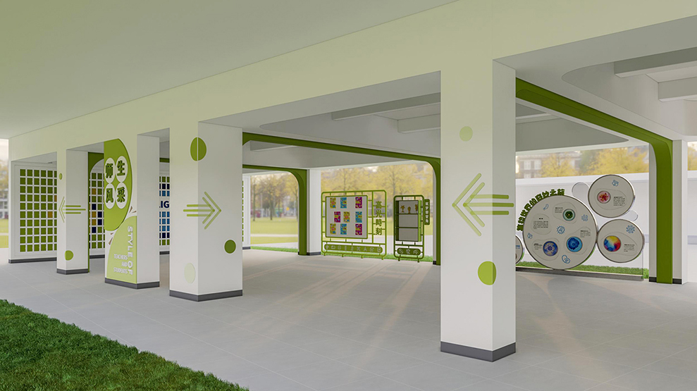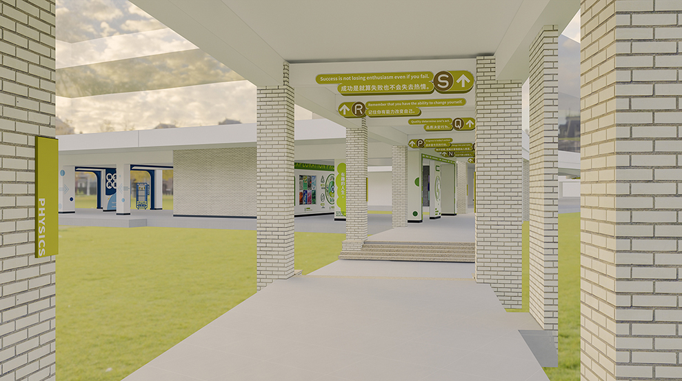 隶属于教学楼(二)的架空层,作为学生们课间时分的休息放松场地,在保证场地最大空间动线的基础上,我们把整个空间划分成三个区域。分别是:历史学区、生物学区、师生风采、心愿墙。在讲述历史、生物专业知识的同时,还能展示师生历史、生物课间的有趣场景。整个空间以清新、简约的绿色为主色调进行整体包装。