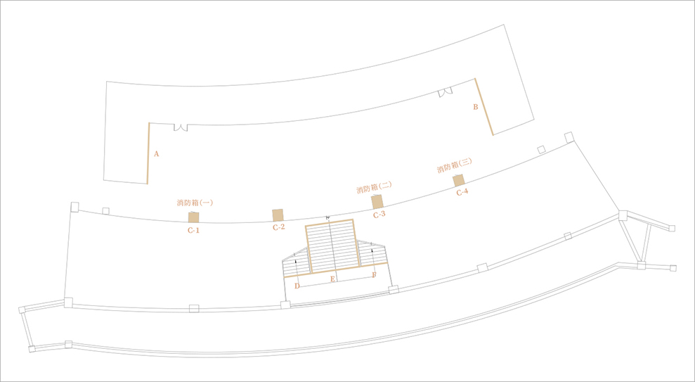 该空间为架空层学生活动空间,在设计上我们最大量保持原有结构,仅针对天花、柱体、墙体进行装饰设计,在天花的处理上根据原有经典的“蒙德里安”色彩构图,重新进行黄色及咖啡色油漆处理。