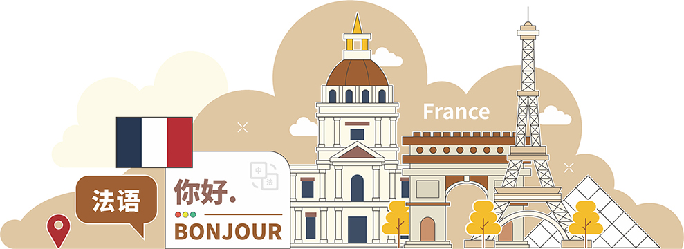 插画创作以:法语为主题,融入法国著名建筑,并以<中文-你好>,在法语中的对照而创作。