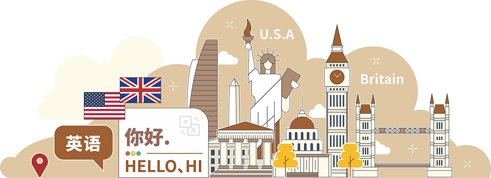 插画创作以:英语为主题,融入英国著名建筑,并以<中文-你好>,在英语中的对照而创作。