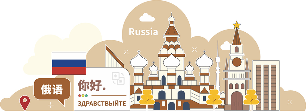 插画创作以:俄语为主题,融入俄罗斯著名建筑,并以<中文-你好>,在俄语中的对照而创作。