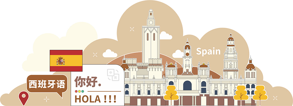 插画创作以:西班牙语为主题,融入西班牙著名建筑,并以<中文-你好>,在西班牙中的对照而创作。