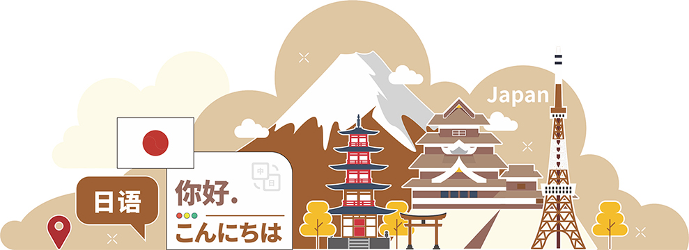 插画创作以:日语为主题,融入日本著名建筑,并以<中文-你好>,在日语中的对照而创作。