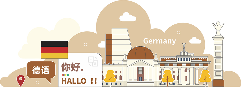 插画创作以:德语为主题,融入德国著名建筑,并以<中文-你好>,在德语中的对照而创作。