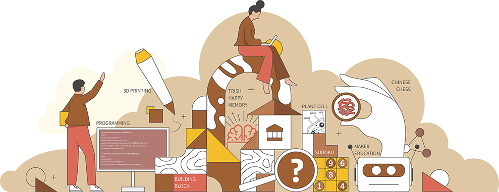 插画创作以:编程+3 d打印+植物细胞+数独+创客+中国象棋元素融入。