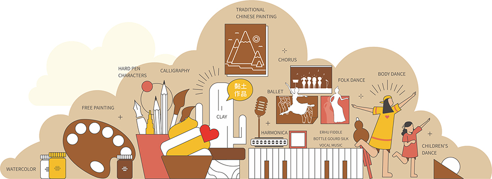 插画创作以:水彩+自由绘画+硬笔字+书法+国画+粘土+合唱+口琴+舞蹈+二胡+小提琴+葫芦丝等元素融入。
