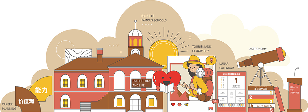 插画创作以:职业规划+名校指南+旅游地理+阴历+天文学+心理生活+童话故事+辩论演讲元素融入。