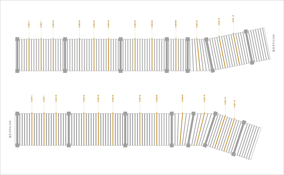 作为教育中心通往教学楼的两条主要连廊,我们对其原有天花进行铝方通格栅化处理,在左右两条长廊上赋予不同的主题,分别进行装饰。一条为:立足中国,另一条为:走向世界。