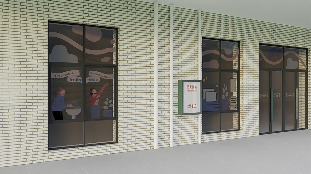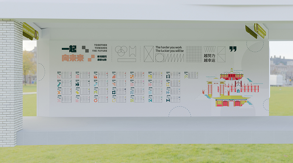 教学楼通往实验楼的尽头是宿舍楼,此面墙位于学生往返教学楼和宿舍必经之路,故墙面打造:本科院校录取分数榜。标题以:一起向未来,进行自我激励驱动。左侧内容展示前290位高校往二年录取分数线,设置可更换形式,以便更新;右侧则以:北京大学、清华大学、哈佛大学、剑桥大学等建筑插画为元素,丰富整体画面。