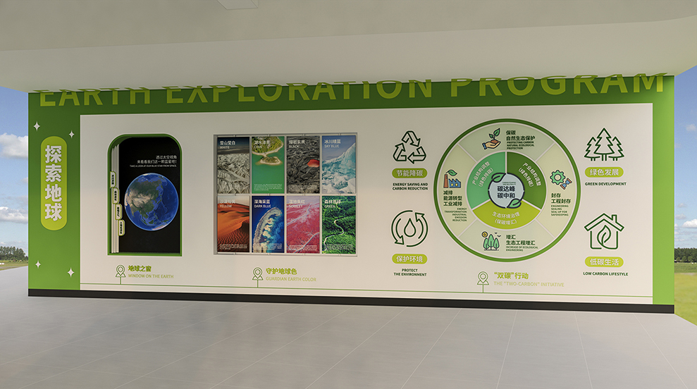 左侧-地球之窗:设计成窗户形式,共有四块推拉板,以太空视角分看来看看地球这颗蓝星,当前面临着的危机:冰川消融(格陵兰岛,通过卫星图像的对比,展示冰川消融)、森林退化(亚马逊雨林,通过卫星图像的对比,展示森林退化)、极端天气(通过图片展示,极端高温、极端低温、极端干旱、极端降水的气象事件)、土地荒漠化(蒙古国,通过卫星图像的对比,显示土地荒漠化)。