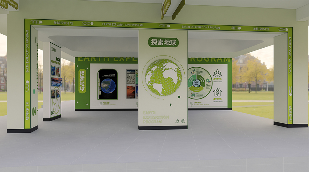 地理园以地球探索计划为主题,保留原有活动空间在墙面主要划分四大主题,分别是:探索地球、地理先驱、地球之美、守护地球,以绿色生机为主视觉,打造观赏互动为一体的展陈空间。