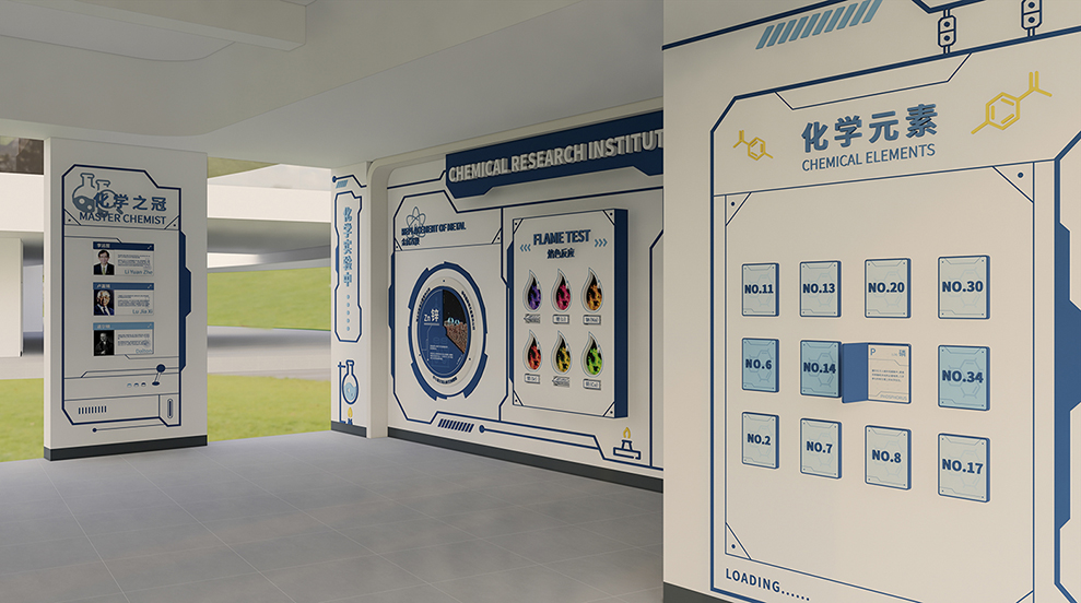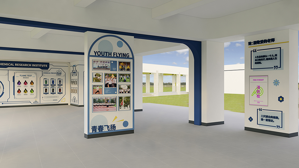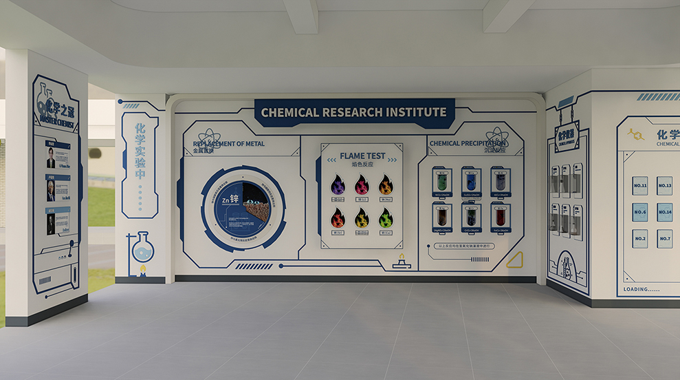 化学主题学习区位于教学楼(三)架空层(后段),我们以化学为主题,分别设有:化学实验、化学仪器、化学元素、化学之冠、师生风采、心愿墙主题,整体以蓝色为基调,融入科技元素,展现化学实验之魅力。