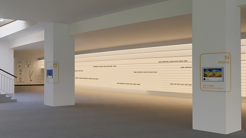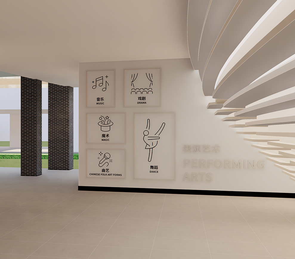 艺术中心大堂主要规划:表演艺术、造型艺术、语言艺术三大主题,在现场有大面积留白的空间立面,进行适当的氛围装饰。