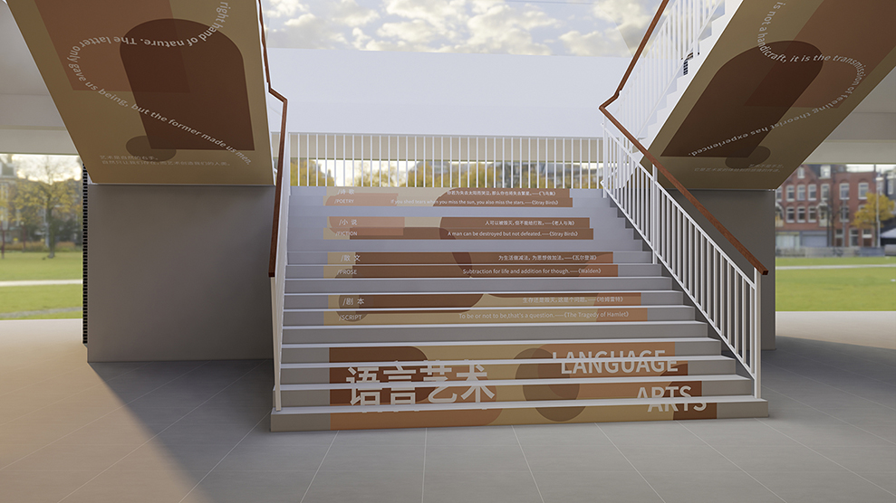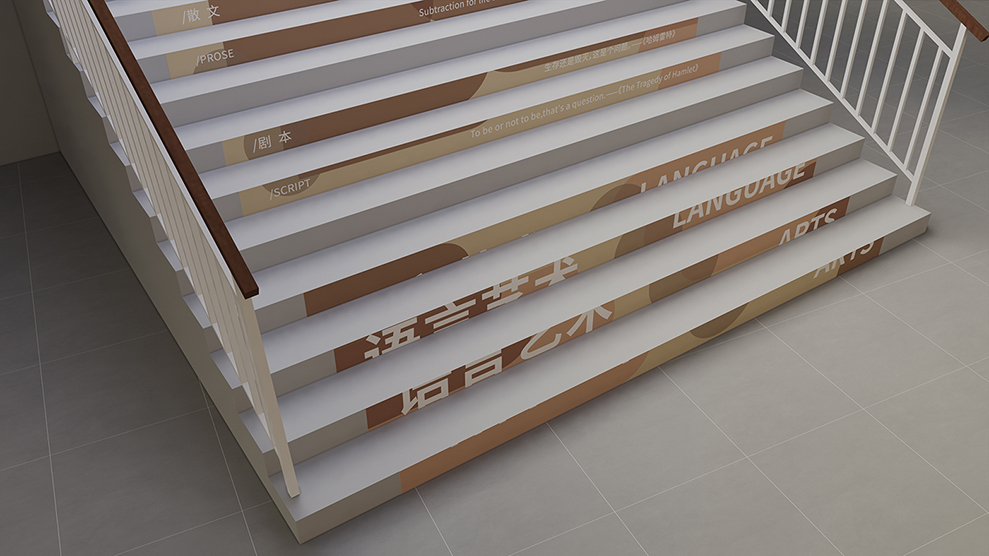 通过二楼的楼梯及楼梯底,则是语言艺术分类:诗歌、小说、散文、剧本,均选择相应的名句加以渲染,如:诗歌,你若为失去太阳而哭泣,那么你也将失去繁星。---《飞鸟集》;小说、人可以被毁灭,但不能给打败。---《老人与海》;散文,为生活做减法,为思想做加法。---《瓦尔登湖》;剧本,生存还是毁灭,这是个问题。---《哈姆雷特》。