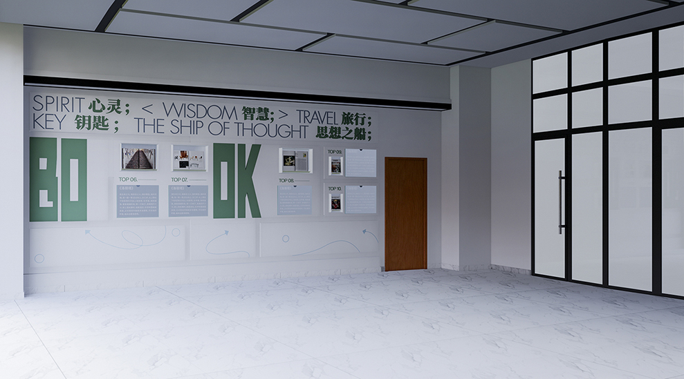 左墙:在保持原有立面造型外,以心灵、智慧、旅行、钥匙、思想之船为大标题,英文BOOK做平均分割,设置前1至前5书籍推荐,透明亚克力盒及镀锌UV印内容,灵活可更换。