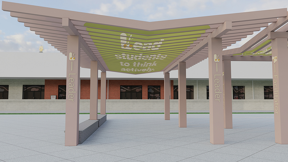 中庭英文角我们在原有基础上进行装饰设计,把可以看到英语角的四个方位进行语言化设计 ,分别以四句教育理念英语短语进化叠级视觉效果包装。