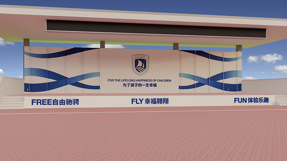 在原有墙面上保留原有标识外,重新增加了教育目标,学校校训及律动的色带,以求丰富整个主席台,成为田径场上的视觉焦点。