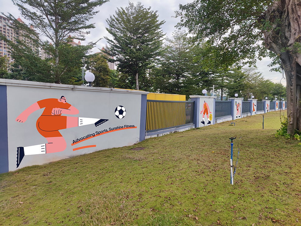 围墙的七面墙,由七幅插图组成,分别代表:足球、篮球、网球、棒球、排球、橄榄球、乒乓球运动剪影组成。相隔一段有一句关于积极运动的励志短语。