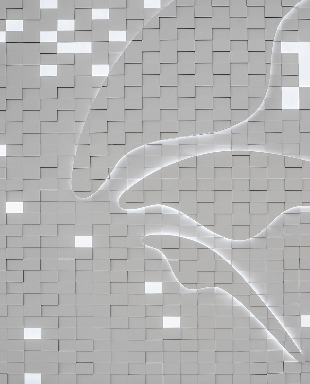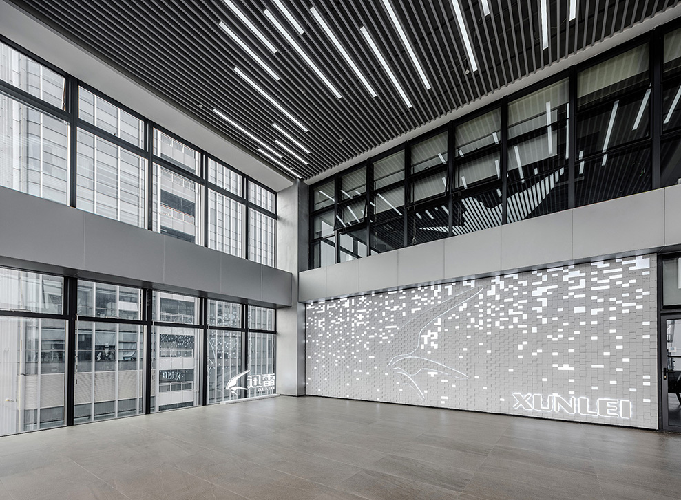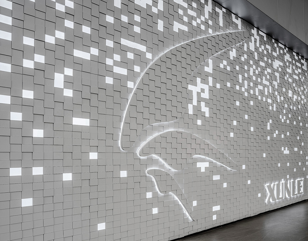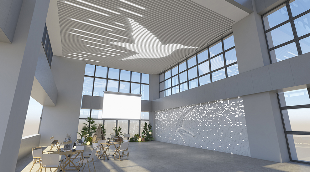 中庭天花在原有铝合金槽内增加蜂鸟造型灯膜,代表着速度,下方可多功能使用,按场景布置使用需求;右侧标识立体造型墙,以马赛克像素为创意,多层次堆叠,铝合金材质定制,多点发光,营造标识发光打卡墙。