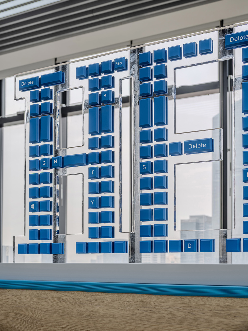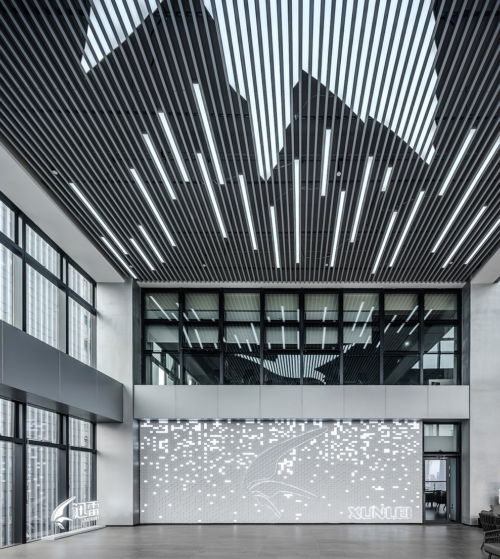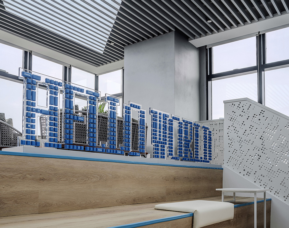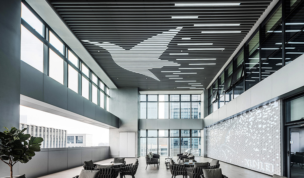 中庭天花在原有铝合金槽内增加蜂鸟造型灯膜,代表着速度,下方可多功能使用,按场景布置使用需求;右侧标识立体造型墙,以马赛克像素为创意,多层次堆叠,铝合金材质定制,多点发光,营造标识发光打卡墙。