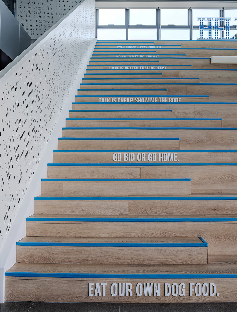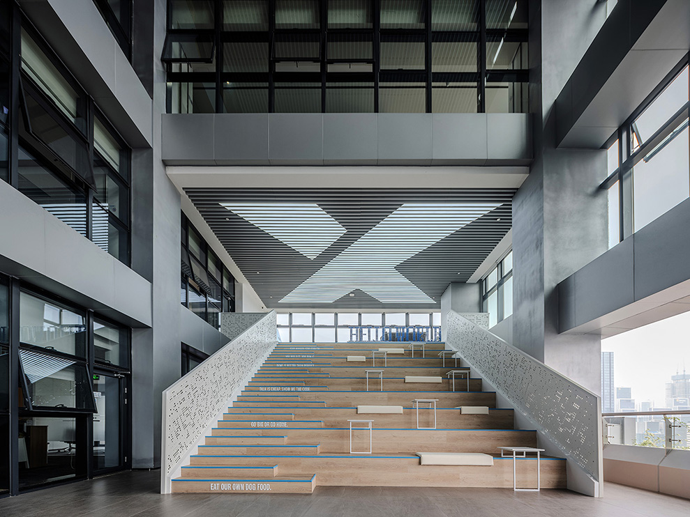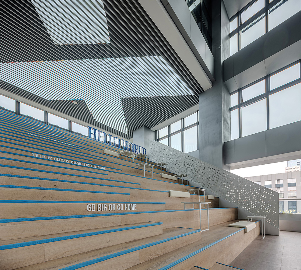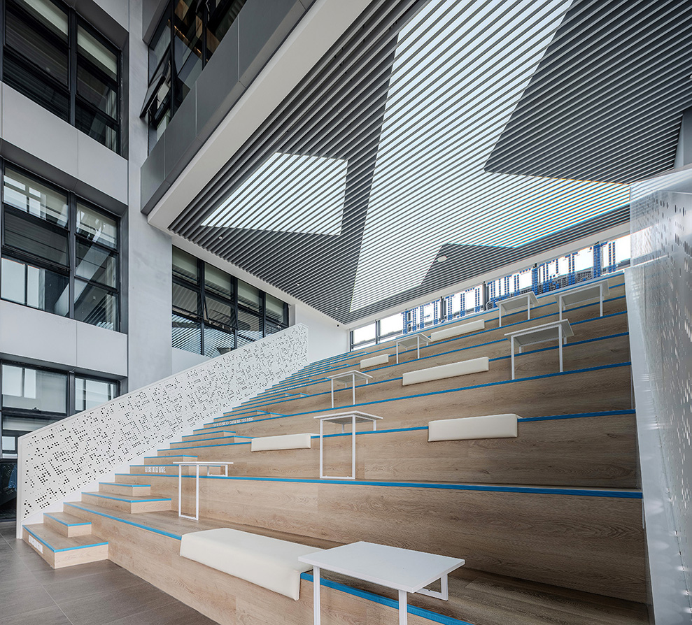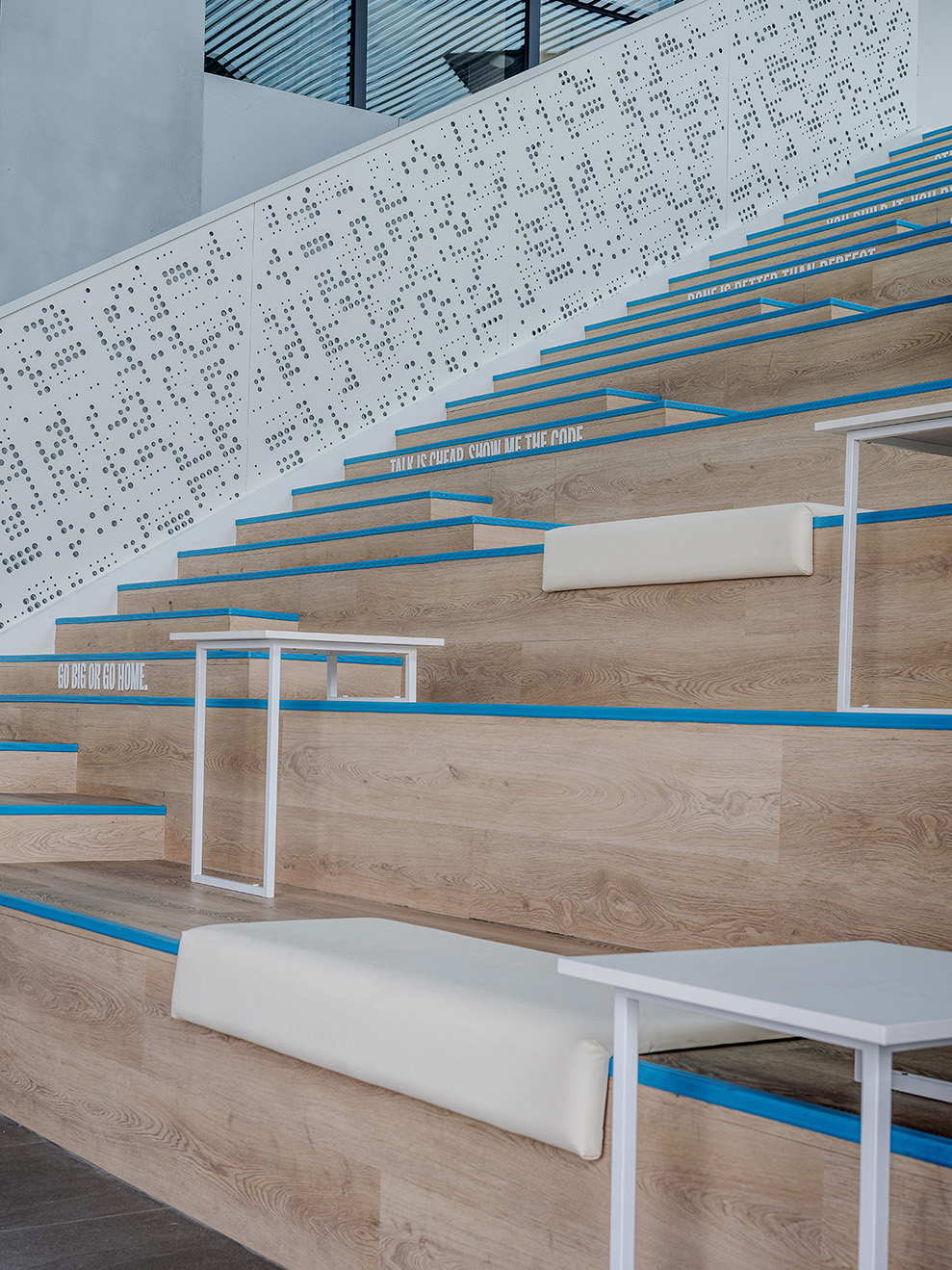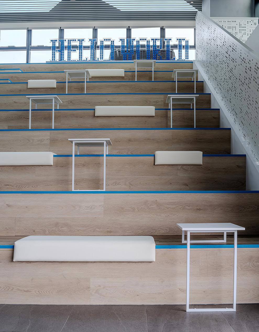 在原有阶梯立面设有六段激励语,蓝色警示包边条的安装,防止楼梯踩空,天花在原有铝合金槽内增加X造型软灯膜,满足夜间照明,固定小桌板及软包坐垫,以备小型会议、生日活动、朗诵阅读等场景需求。