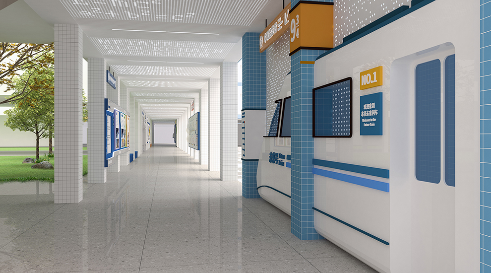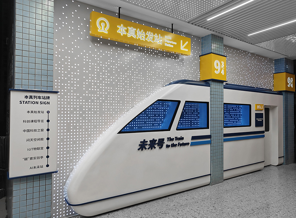 科技长廊位于进入学校大堂的左侧,以“未来”为主题,整体采用蓝色色调,由七个主题墙面构成,他们分别是:本真始发站、科创课程导览、中国科技之窗、问天空间舱、IOT物联宫、碳索实验亭、AI未来阁组成,错落有致的分布在过道连廊上,即不影响动线,也不影响光线,作为同学们“课后学习”空间。整个科创长廊通过模型、科普、互动来实现,引导同学们积极参与科技创新实践,培养创新思维,让我们跟随一趟列车,开启本真科创之旅吧!