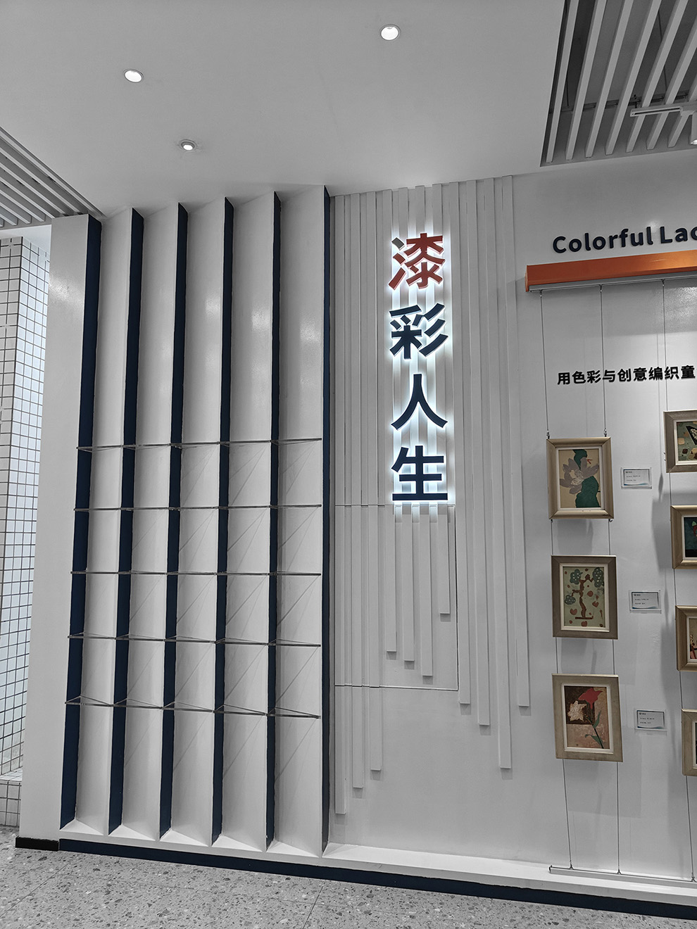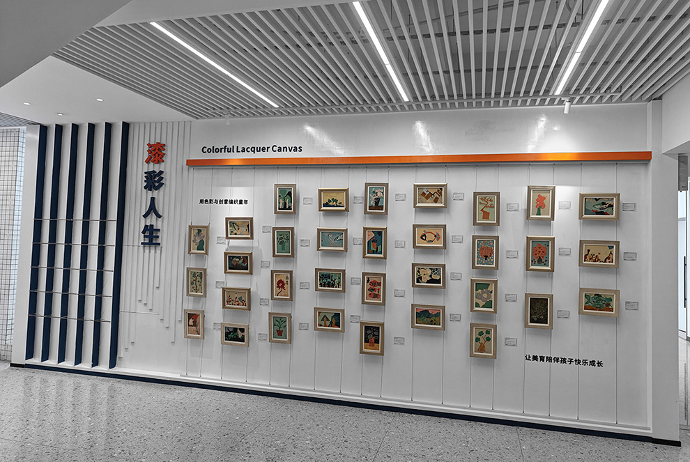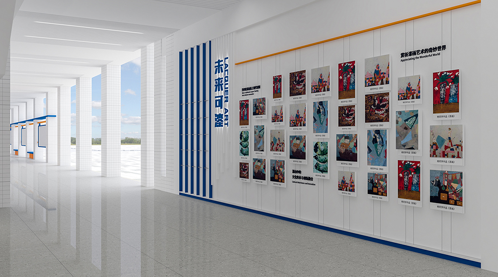 艺术长廊位于进入学校大堂的右侧,整体在保留原有空间上进行改造设计,合理规划七个版块内容,分别是:未来可漆、阅读角、融合艺术、展示区、师生同创、本真邮局、阶梯报告厅,通过以展示互动的方式进行呈现。