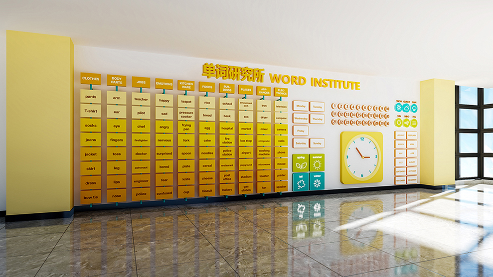 左半部分“单词在哪里?”:每格设计有亚克力放置英文字母,左侧有游戏说明规划,同学们可以根据提示寻找出相对应的单词,以锻炼同学们英文单词拼写的能力。