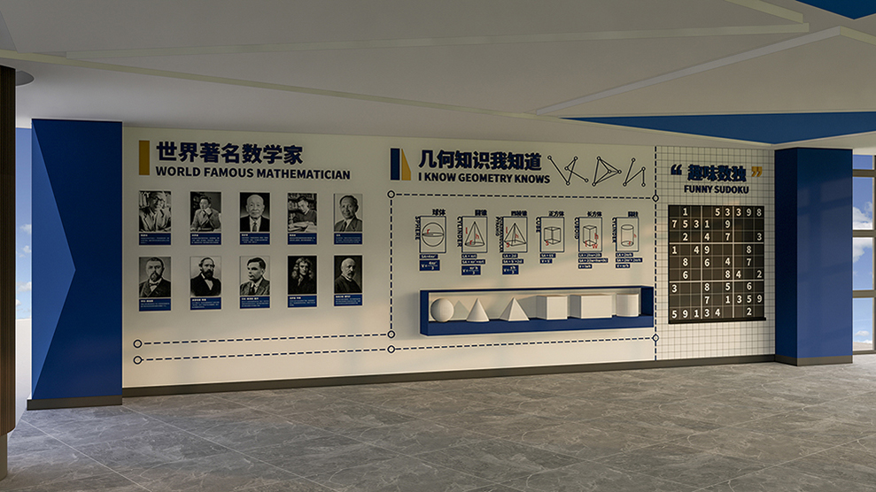 右边部分是:趣味数独墙,设计了一块方形小黑板,同学们可以用粉笔在上面补充相应答案,通过填充数字玩数独,锻炼同学的思维能力,老师们亦可每周或每月更新数独题目,优秀解题的同学可以得到些许奖励,提高同学们的兴趣,让数学兴趣从游戏开始。