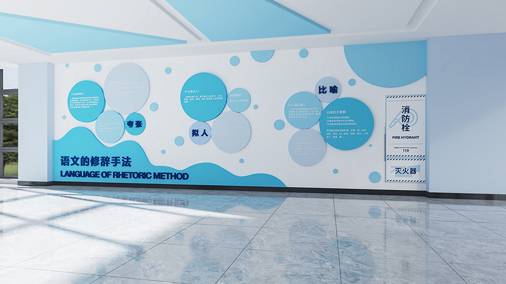 位于小学部教学楼的中空层,每一层楼同一个位置,2至5层楼,我们分别确定:英语、数学、语文、道法四个主题,在不改变现有的空间立面之上,我们分别对天花,及左右二面空白墙进行点缀装修性设计,2楼则以橙黄色,3楼以深蓝色,4楼以淡蓝色,5楼则以青绿色。