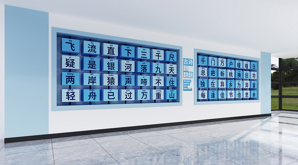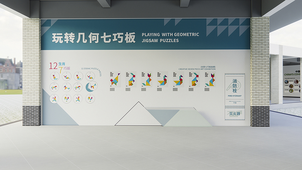 左墙设计主题为:玩转几何七巧板。七巧板是我们古老智慧的结晶,通过七巧板,可以构建出多种图案。左部分为:12生肖,均由七巧板拼成,同学们通过旋转,可以看到底部每个生肖所代表的动物科普。右部分为:同学通过折纸,自己拼贴创造的作品,通过装饰挂画的方式陈列。下方设了展柜,有木块七巧块,同学们可以自由组装。