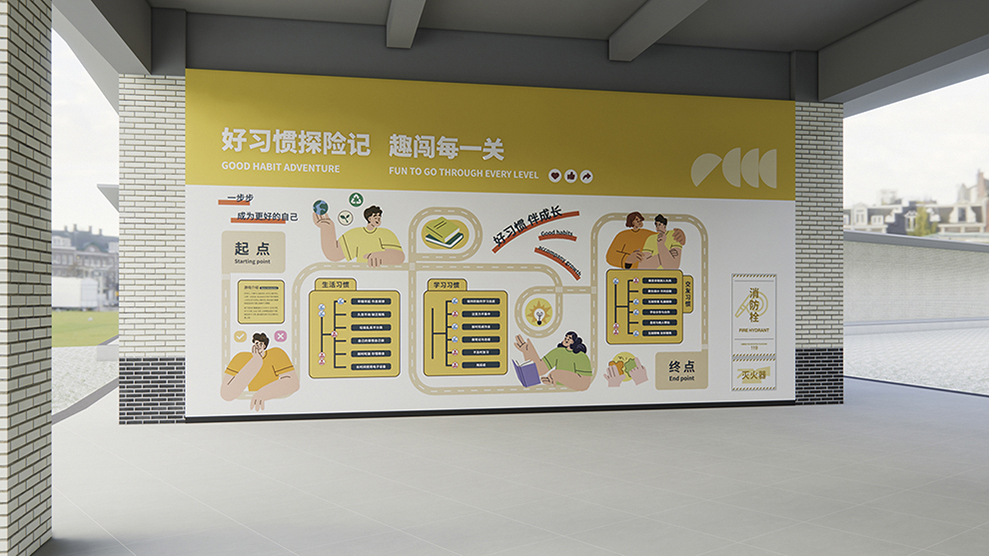 左墙设计主题为:好习惯探险记,趣闯每一关。该墙的设计,以游戏闯关的形式,闯关内容分为三种:生活习惯、学习习惯、交友习惯;分辨哪些是好习惯,哪些是坏习惯,挪动圆形棋子到正确的位置上吧,全部挪动正确则代表完全胜利。
