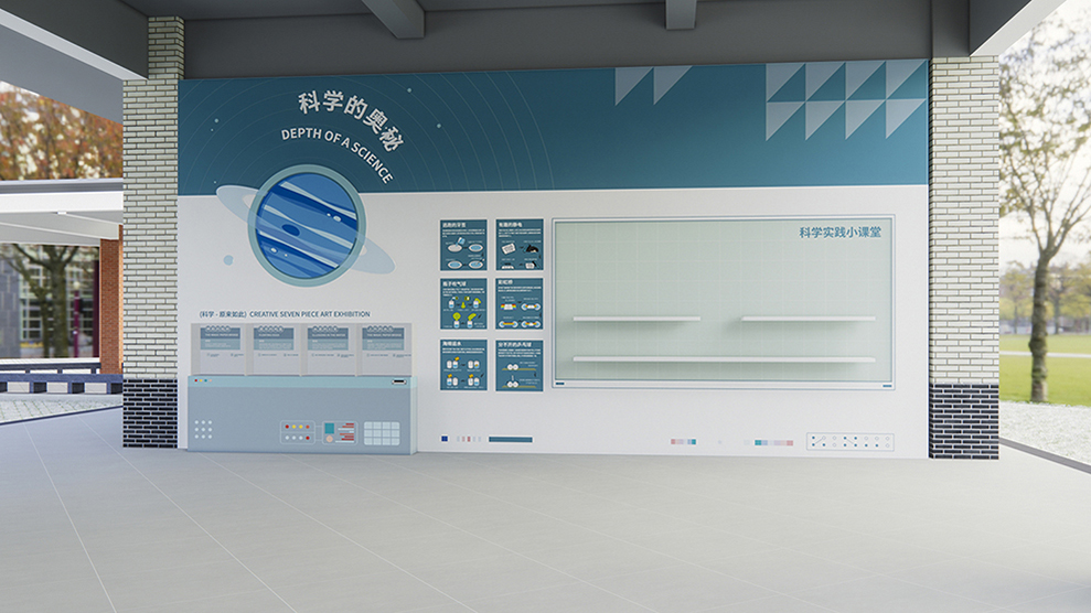 左墙设计主题为:科学的奥秘。左部分列举4个科学实验:◆神奇的纸桥、◆漂浮的鸡蛋、◆水里的幻觉、◆上升的水位,文字讲述背后逻辑,配合下方展台,陈列的展示道具,可供同学们操作体验。右部分列举6个科学实验:◆逃跑的牙签、◆有趣的静电、◆瓶子吹气球、◆彩虹桥、◆海绵运水、◆分不开的乒乓球,配有一块展板,同学们可以手写报告,列举其他的科学奥秘,然后进行张贴展示。