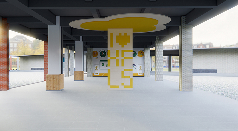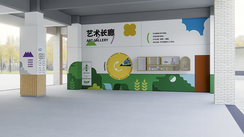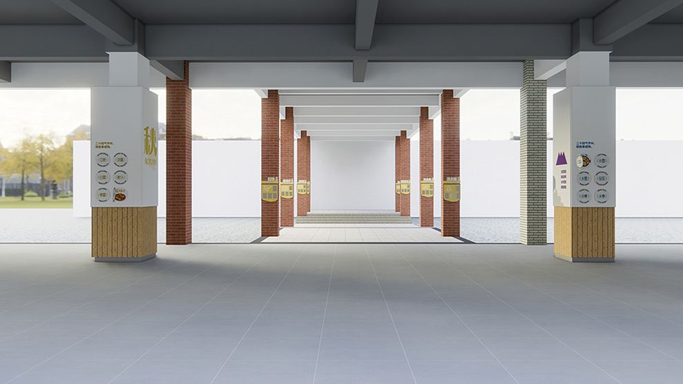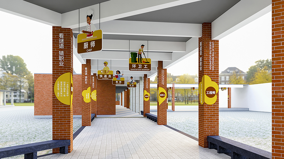 架空层通往学校食堂长廊,天花我们设置了劳动者主题插画吊牌装饰,柱体通过看谜语-猜职业来进行有趣互动。
