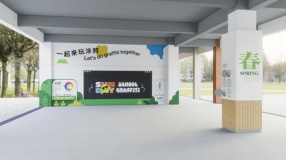 此墙设计主题为:一起来玩涂鸦。左侧为色相环,同学们可以通过旋转色相环了解色相环的由来,下方放有七种色彩的粉笔,同学们可以在右侧的黑板上进行自由涂鸦绘画。