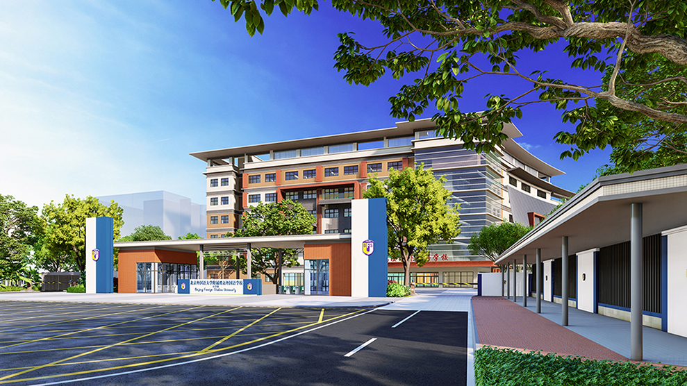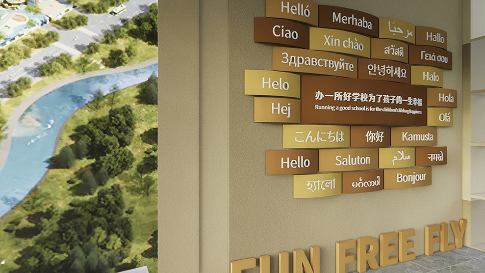 接待形象墙左侧为整个学校建筑鸟瞰图为主,右侧为您好,相对应该的全球语言,以此彰显我们是以外语为特色的办学特色,下方FUN FREE FLY,则代表着我们的教育理念,以金属侧弯板来表现,呼应周围香槟金色。