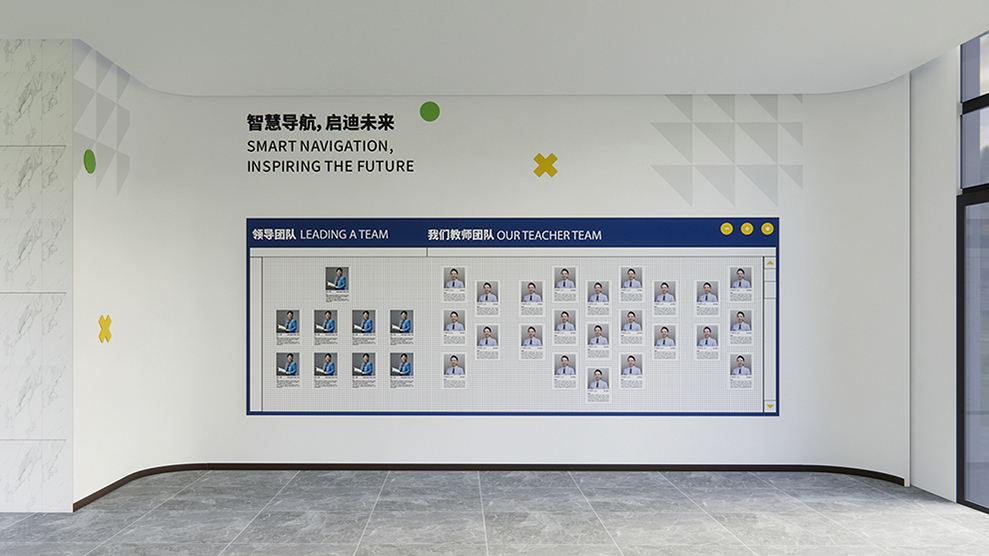 该面墙主要展示,我们的师资团队,整体搭配学校标准色彩,分为:领导团队&教师团队,底板为冲孔镀锌板,可更换可张贴。