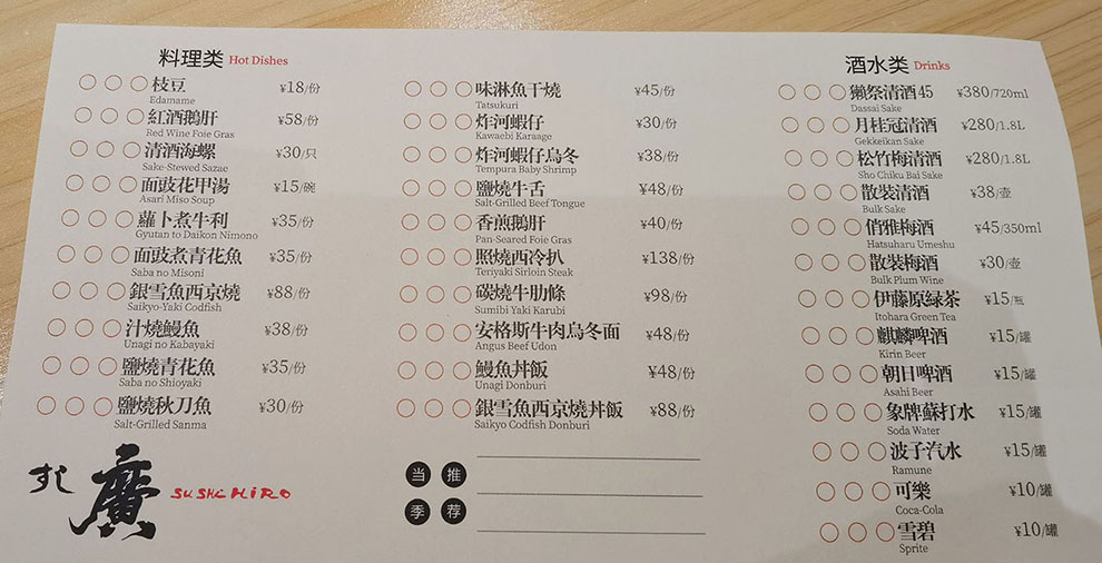菜单的设计,我们分为二类,一类是纸质点单,一类是电子IPad点单,纸质菜单方便客人快速勾选,电子ipad是为了方便客人图文对比快速下单。纸质菜单分为A4大小及A5大小,A4菜单包括:手握类、卷物类、寿司丼、刺身类、手卷类;A5菜单主要是指厨房类,包括:料理、酒水。除此之外空间还设有黑板,推荐当季新品料理,方便客户在用餐时下单。