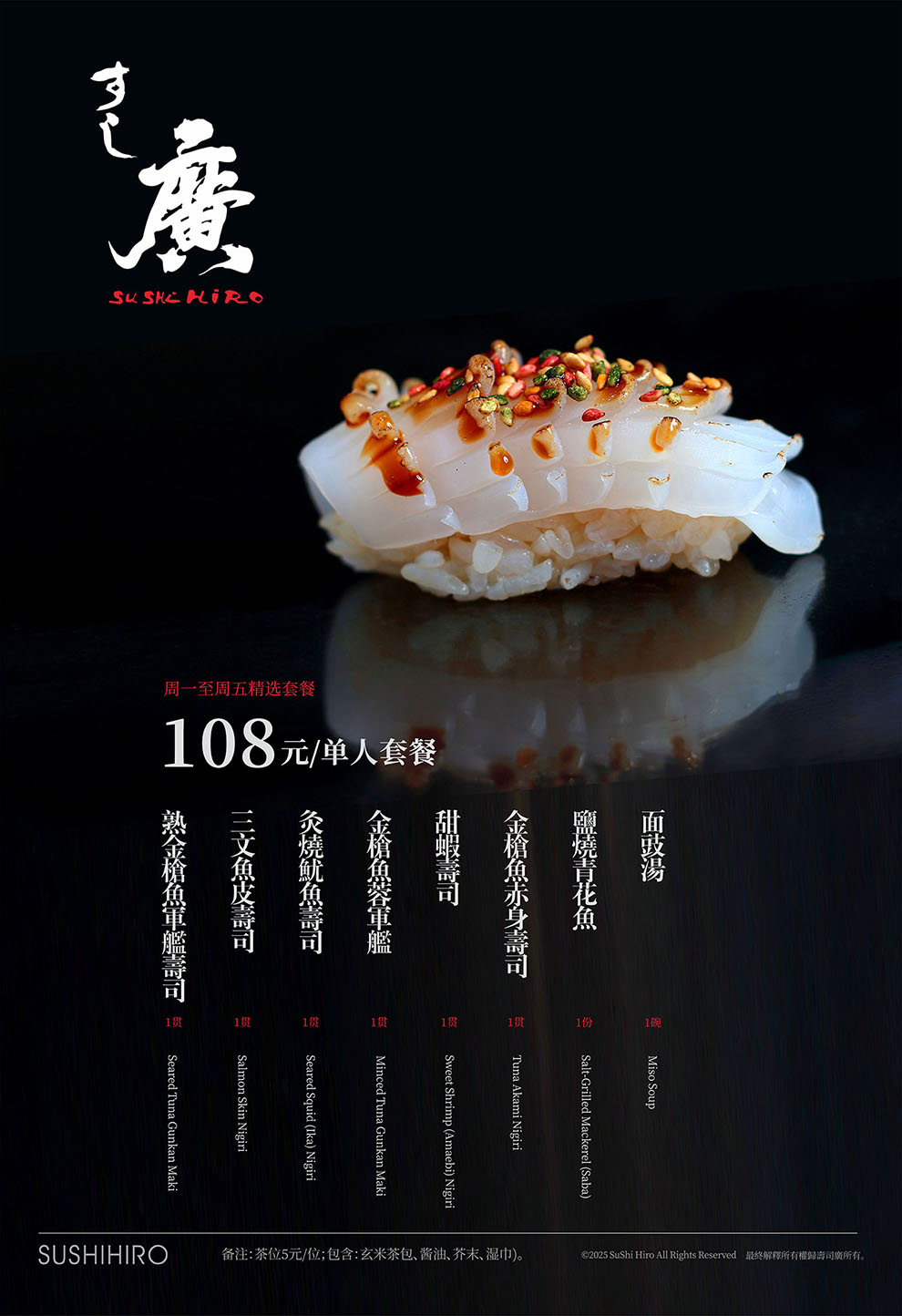 标志的设计,我们以中文字体为核心,邀请书法老师泼墨挥毫,中文名为:寿司廣,英文名为:Suhi Hiro,日文名:すし廣,通过不同高低大小,形成不同组合应用不同场景。