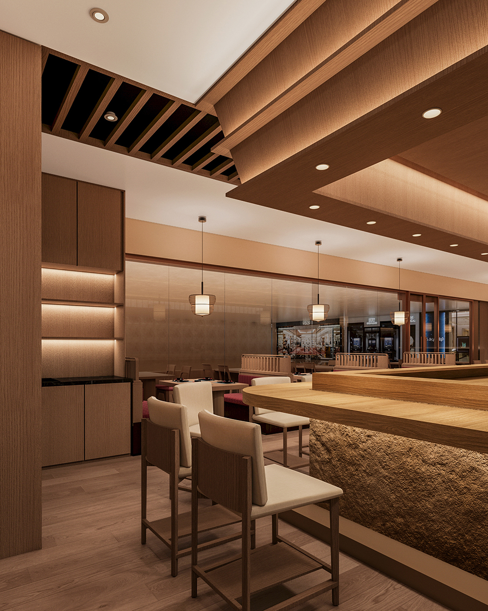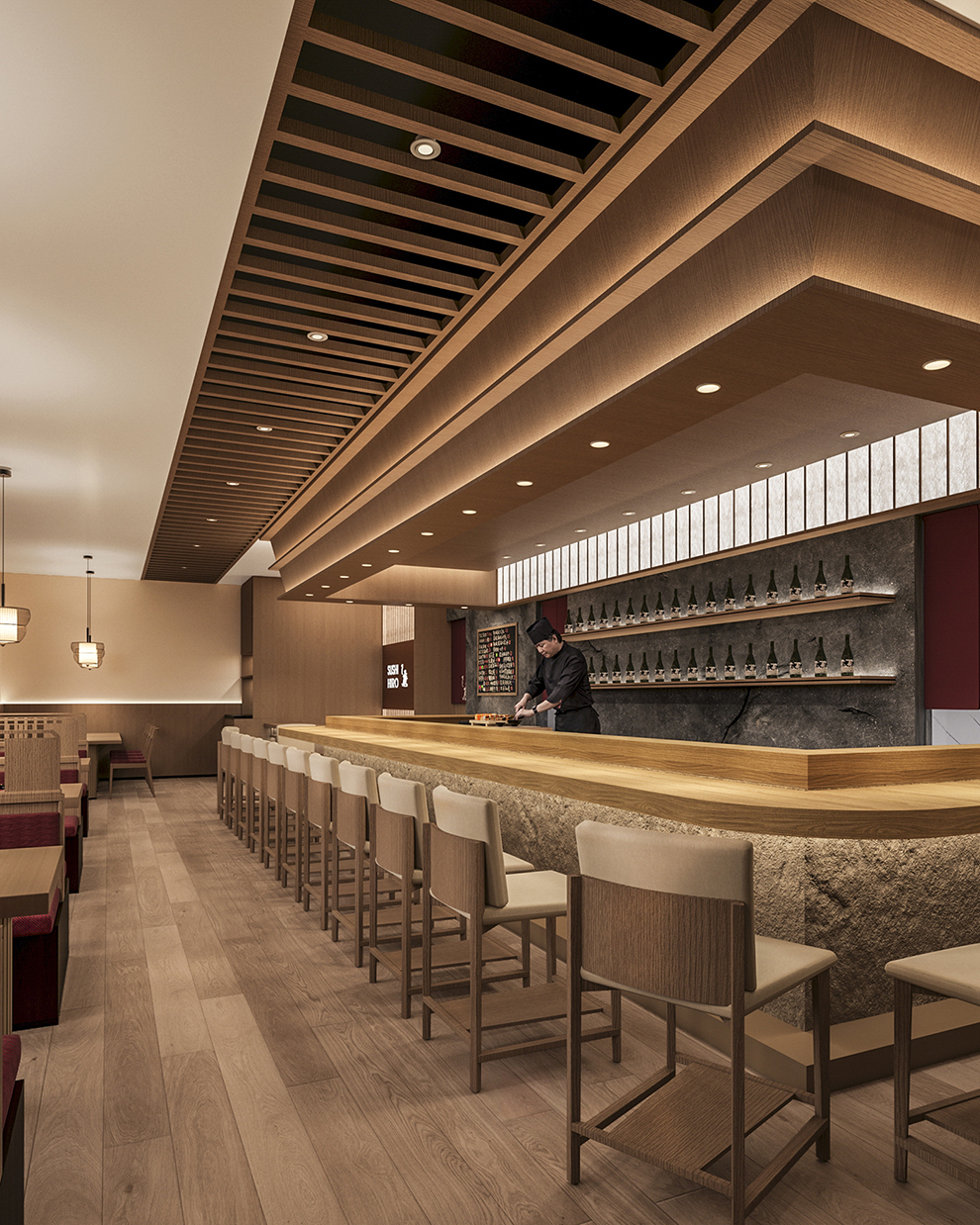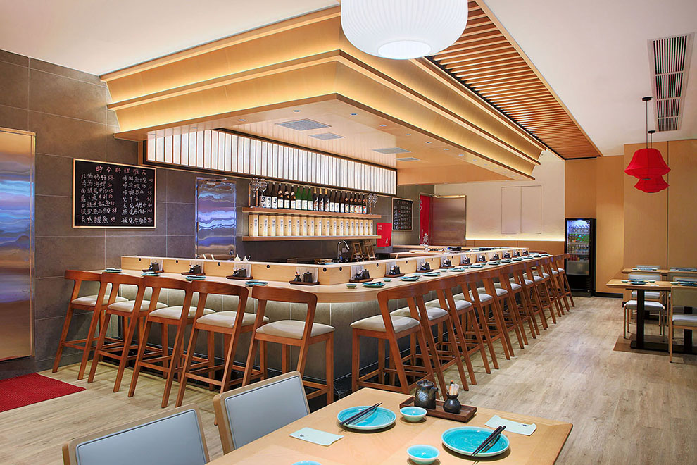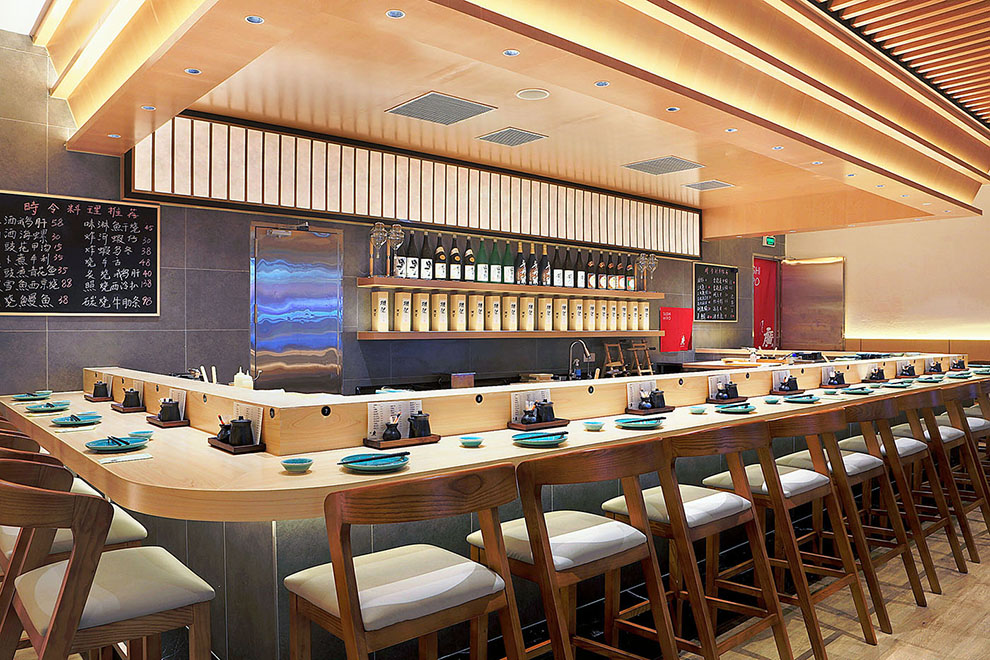 吧台的设计,以桧木为质感,二层台面,背景以PU彷石材为主,上方杜邦纸灯膜与木线条,天花呈回字型阶梯状,灯光层次分明,大家绕板前师傅围座一起,体验鱼生带来的快乐。