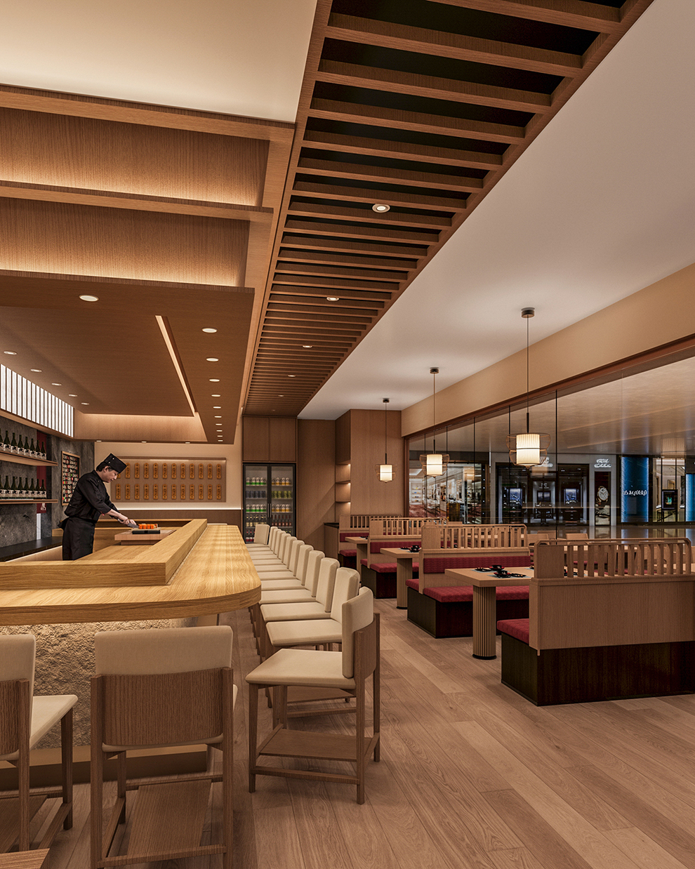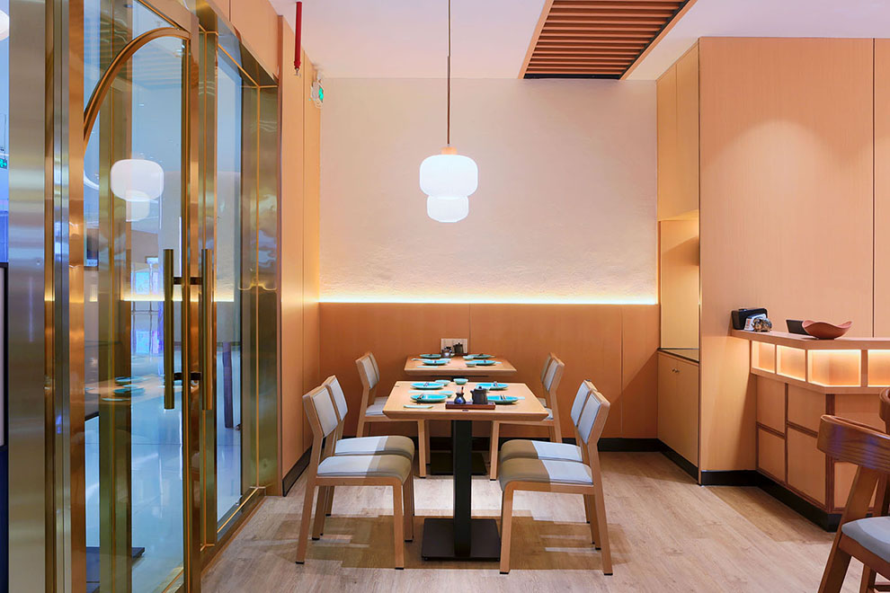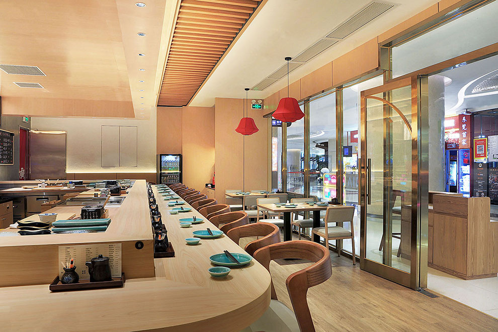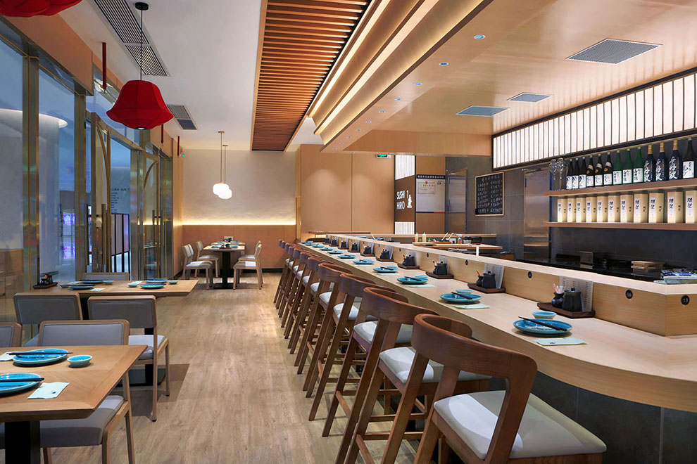 空间的设计,我们以原木风为主要风格,原木给人以温润的质感。板前寿司最大的设计就是吧台的设计,为了保证营业面积的最大化,吧台我们设计了20座位,另外设立了四人位二桌,可拼桌,二人位三桌,室内可以实现34个餐位,外摆四人位五桌,可以实现20个餐位,共54个餐位。