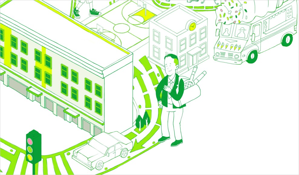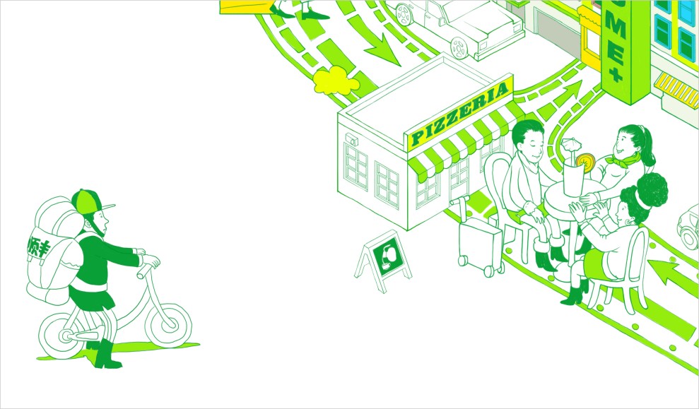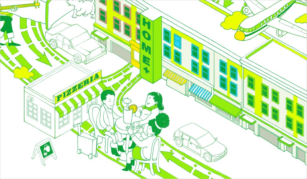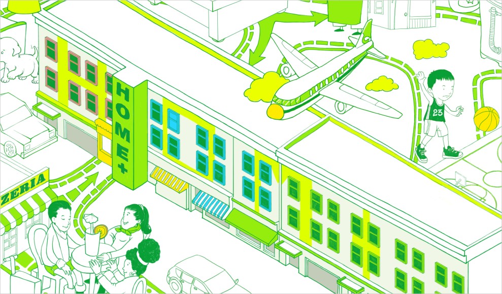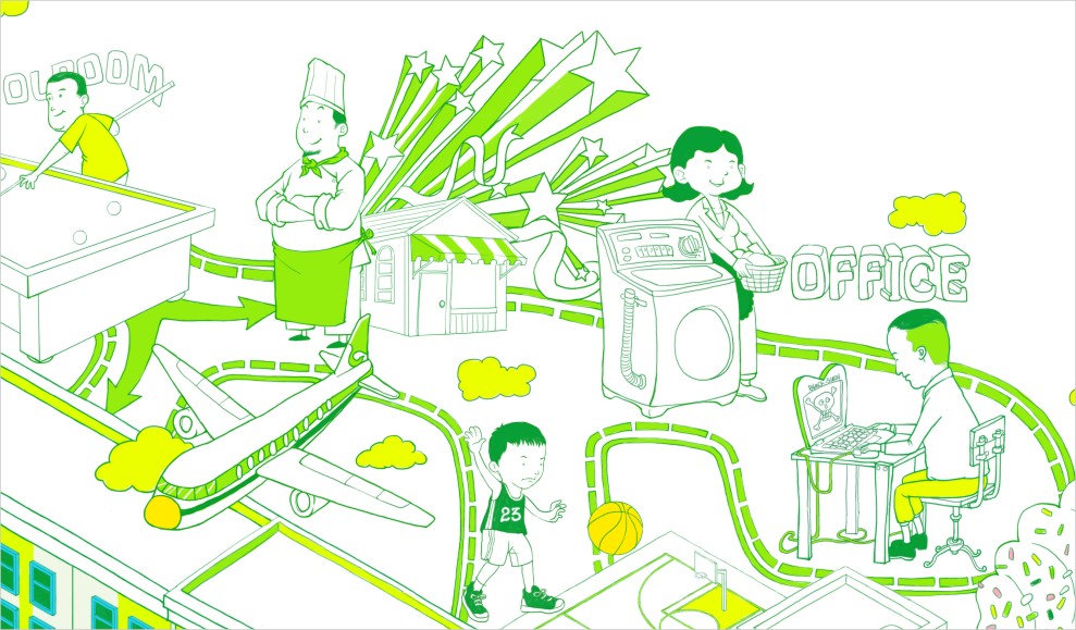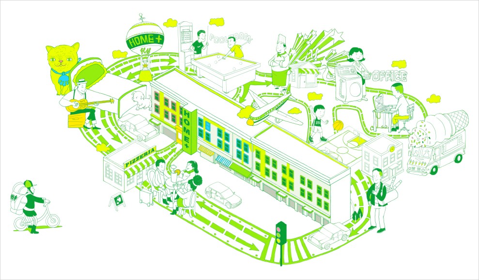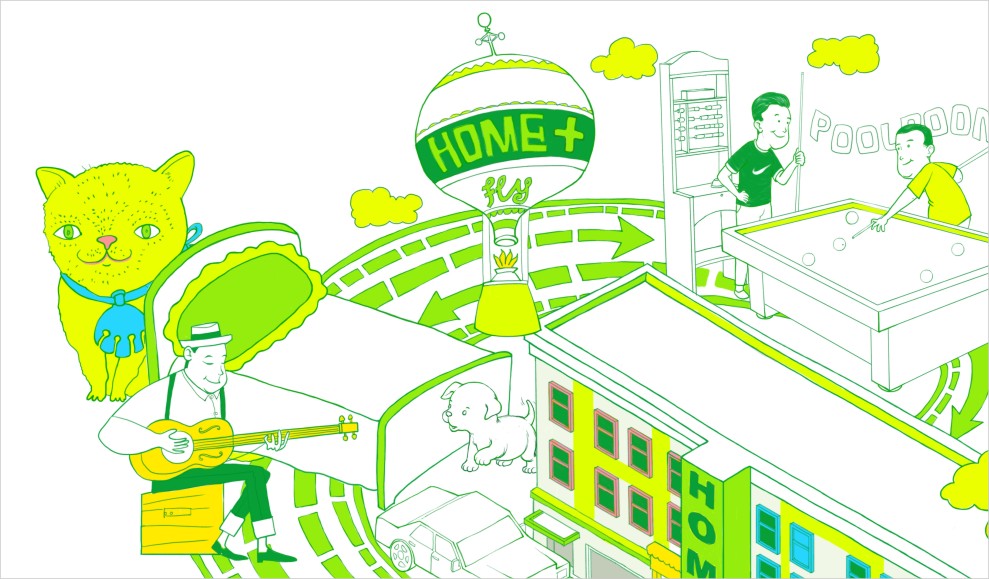 在其插画上,我们以建筑为载体,主要描绘的是,围绕这栋公寓从而发生美好的故事,比如我们可以养宠物、弹弹吉他、运动健身、同朋友下午茶等活动。把青春公寓的年轻气自生动的表现出来……