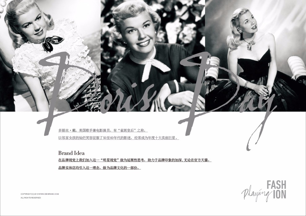 多丽丝·戴,美国歌手兼电影演员,有“雀斑皇后”之称,以邻家女孩的灿烂笑容征服了50至60年代的影迷,经常成为年度十大卖座巨星。在品牌视觉上我们加入这一“明星视觉”做为延展性思考,助力于品牌印象的加深,无论在官方天猫,品牌实体店均引入这一理念,做为品牌文化的一部份。