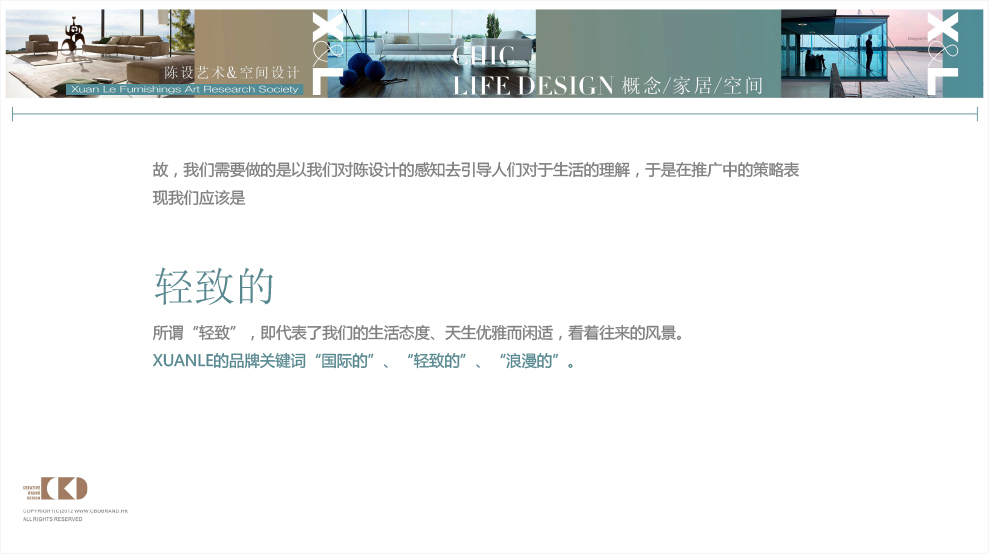 故,我们需要做的是以我们对陈设计的感知去引导人们对于生活的理解,于是在推广中的策略表现我们应该是轻致的所谓“轻致”,即代表了我们的生活态度、天生优雅而闲适,看着往来的风景。XUANLE的品牌关键词“国际的”、“轻致的”、“浪漫的”。